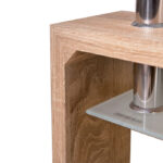 Esta mesa auxiliar tiene una superficie de vidrio templado y una estructura en madera DM con el acabado lacado en blanco brillo. La mesa presenta patas de madera lacadas de alto brillo y superficies de cristal templado de 8mm (cristal superior) y glasse de 5mm (cristal inferior).